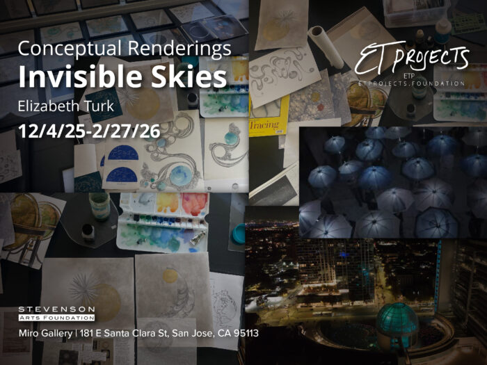 This exhibition is a prelude to the upcoming immersive art experience, Invisible Skies San Jose flash, in January 2026. Artist Elizabeth Turkwill create a series of participatory, community-centered art experiences throughout San Jose, and this solo exhibition offers an intimate look into the ideas and inspirations behind the project. Featuring her sketchbooks, photographs, and digital works from her projects, the exhibition invites viewers into Turk’s creative process and the conceptual foundations of the performance to come.